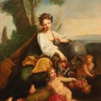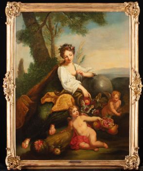 Dipinto olio su tela attribuito a Sébastien II LECLERC (Parigi 1676-1763) "Allegoria dell'Estate". Dimensioni tela : 97,5x75 cm. Con cornice : 108x85 cm. Sulla parte inferiore della cornice trovasi etichetta in metallo con la scritta "Coypel Noel Nicolas".