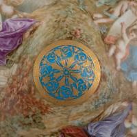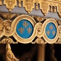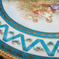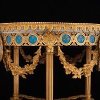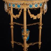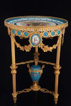 Eccezionale gueridon in bronzo finemente cesellato e dorato con piano in porcellana policroma . Francia. Epoca : II metà XIX sec. HxD : 72x51 cm.