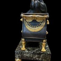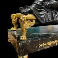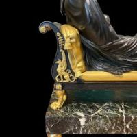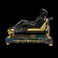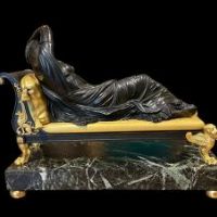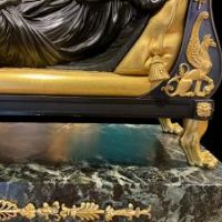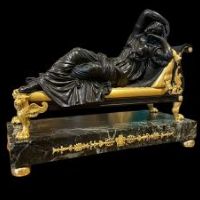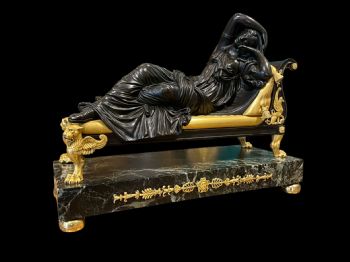 Eccezionale scultura in bronzo brunito e bronzo finemente cesellato e dorato al mercurio su base in marmo verde antico , raffigurante "ARIANNA DI NASSO". Francia. Epoca : Impero. HxLxP : 34x40x17 cm.