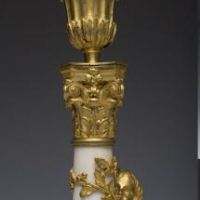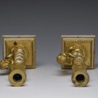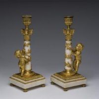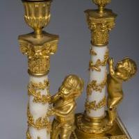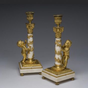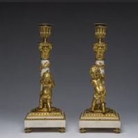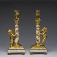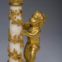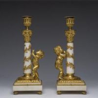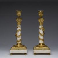Raffinata coppia di candelieri in bronzo finemente cesellato e dorato al mercurio e marmo bianco di Carrara. Francia. Epica : LXVI. H 30,5 cm.